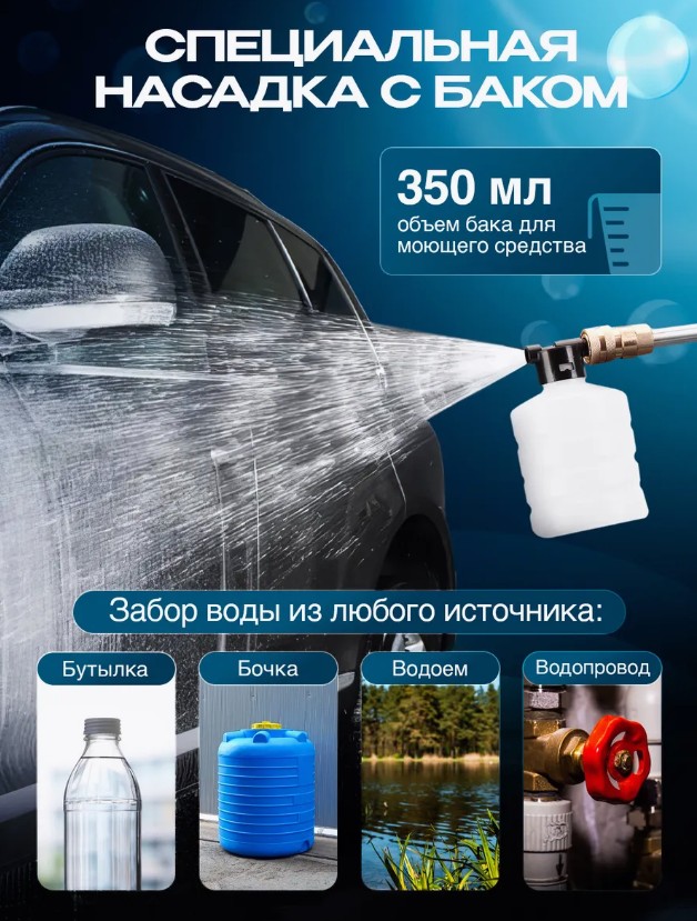 Дополнительные насадки и пеногенератор превращают этот инструмент в настоящую мобильную автомойку! Создавайте густую пену, легко очищайте даже труднодоступные места и забудьте о долгих поездках в сервис. Компактность, функциональность и мощность – вот что делает эту минимойку идеальным решением для каждого автовладельца!
