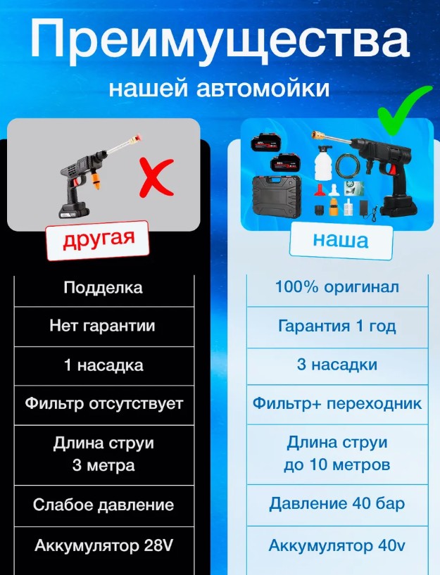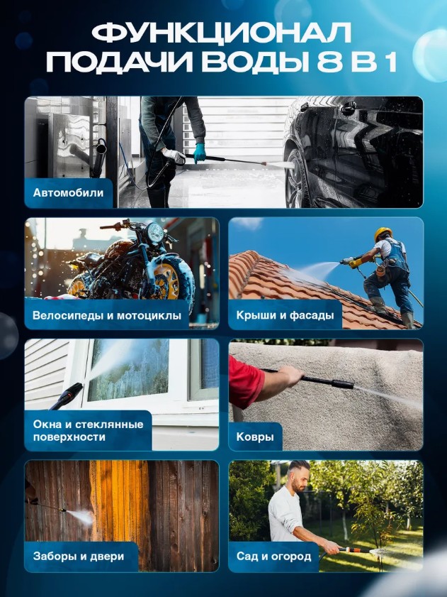 Забудьте о сложностях ручной мойки и громоздких аппаратах! Аккумуляторная мойка высокого давления – это мощное, компактное и удобное устройство, которое поможет вам поддерживать чистоту автомобиля, мотоцикла, садовой мебели и даже фасада дома. Благодаря давлению до 40 бар, вы легко удалите даже самые стойкие загрязнения, не рискуя повредить поверхность.