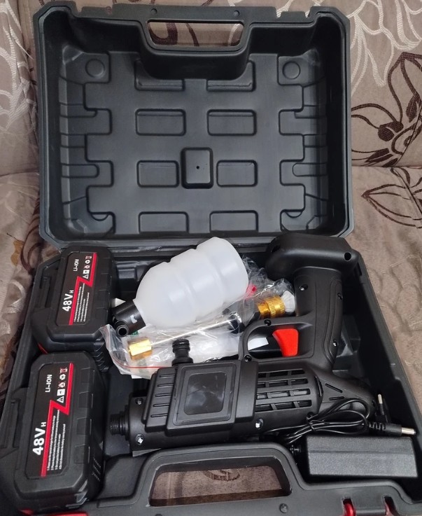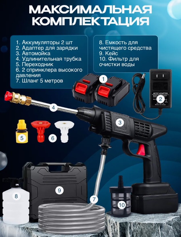 В комплекте предусмотрены два мощных аккумулятора, которые обеспечивают длительную автономную работу. Вам не нужно искать розетку или подключать сложные системы – просто зарядите устройство и используйте его где угодно: на даче, в гараже, в поездке. Встроенный фильтр для воды позволяет использовать воду из водоемов, делая процесс мойки еще удобнее.